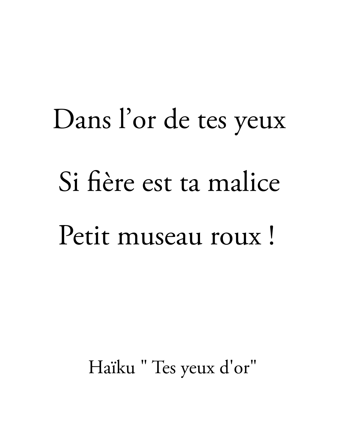 Le petit + personnalisé qui fait la différence : lorsque vous commandez votre portrait vous m’adressez un petit texte de présentation de votre animal, avec des éléments biographiques particuliers pour vous et qui ont toute leur importance. En échange, je vous livre, avec votre portrait dessiné, un joli poème en l’honneur de votre animal, sous forme d’haïku ou d’acrostiche avec son nom. Il vous est livré imprimé sur une petite carte au format carte postale (A6) ou un peu plus supérieur (A5).
