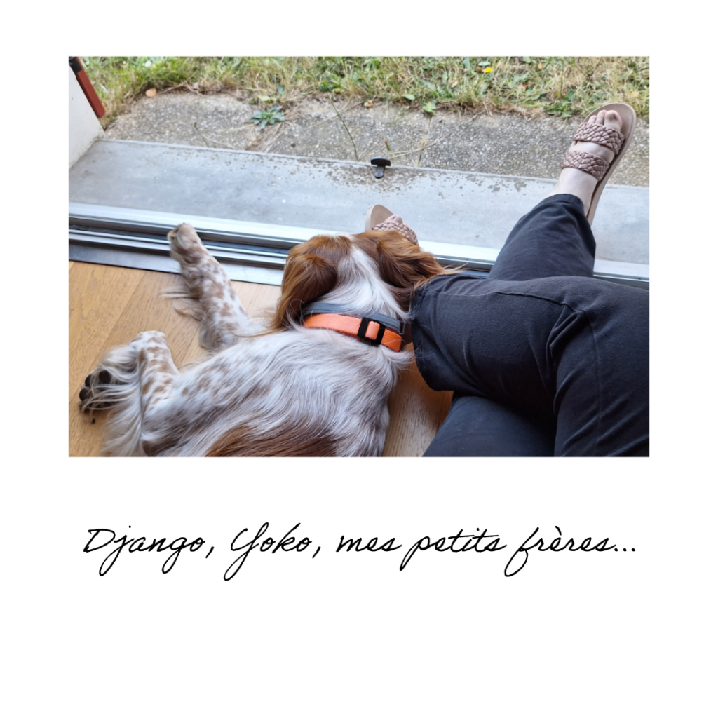 Je venais d’emménager dans une petite maison à la campagne où en cinq minutes à pieds je pouvais me retrouver dans les champs et les sentiers boisés. C’est à ce moment aussi qu’est arrivé dans notre vie Django, notre premier petit épagneul, adopté à la suite du décès de mon papa…. Nous en avons fait des balades complices sur les sentiers ! Aujourd’hui c’est Yoko qui m’accompagne, un autre petit épagneul tout aussi affectueux… et toutes ces expériences ont profondément aidé à ma renaissance.